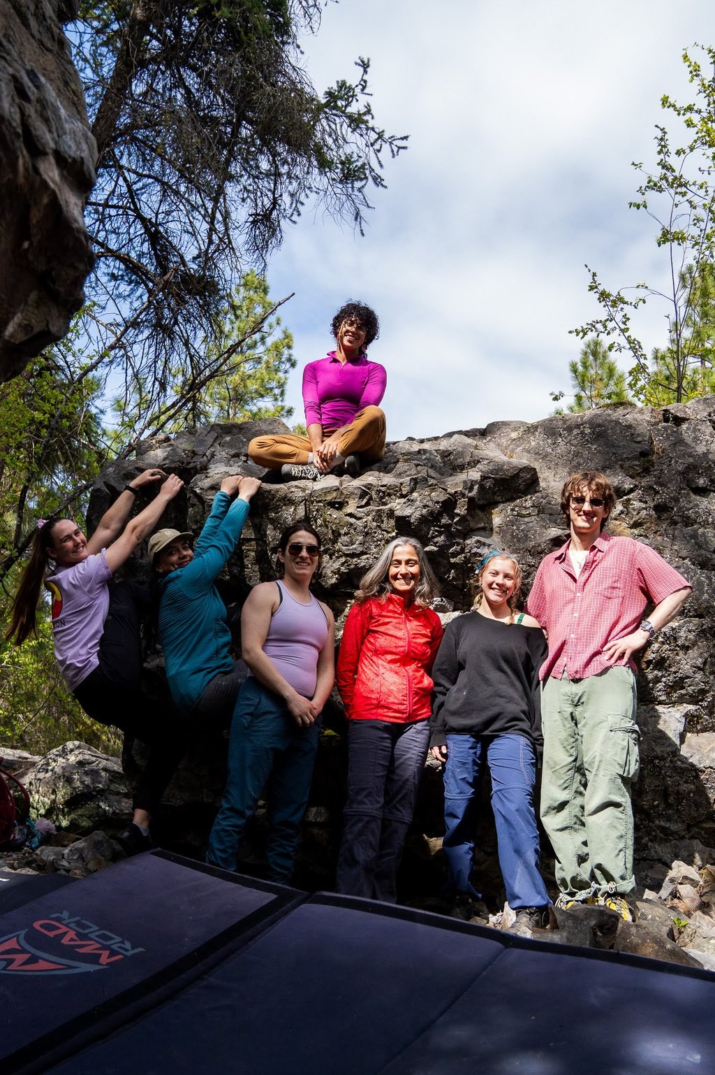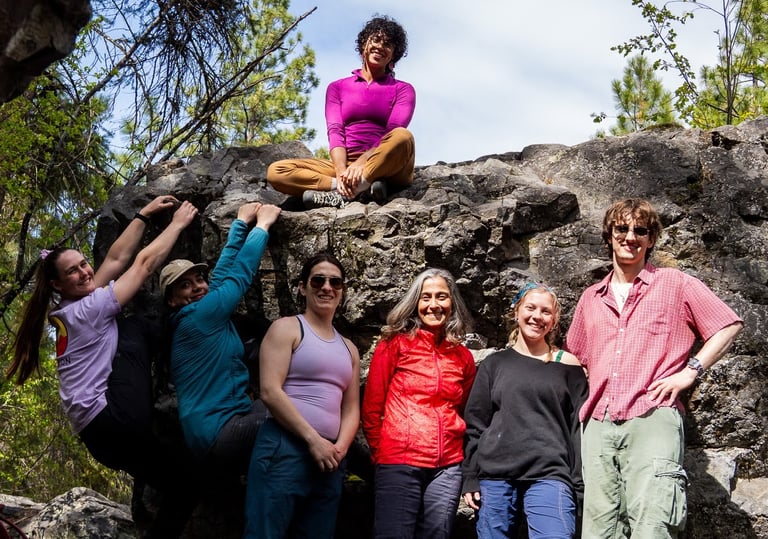 The group spent a sunny day among the spring flowers at our Intro to Outdoor Bouldering Workshop! The Ruins provided the perfect location to learn and practice pad placement, reading routes, topping out boulders, technique and more☀️. This event is part of our Equitable Outdoors Series, aimed to equip IBPOC, Newcomers and Immigrants with the knowledge and practical skills to recreate responsibly and meaningfully on syilx territory.